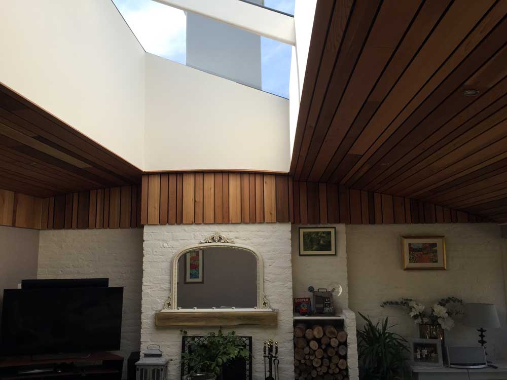 Removal of existing roof and replaced with curved ceiling and cedar sheeting.